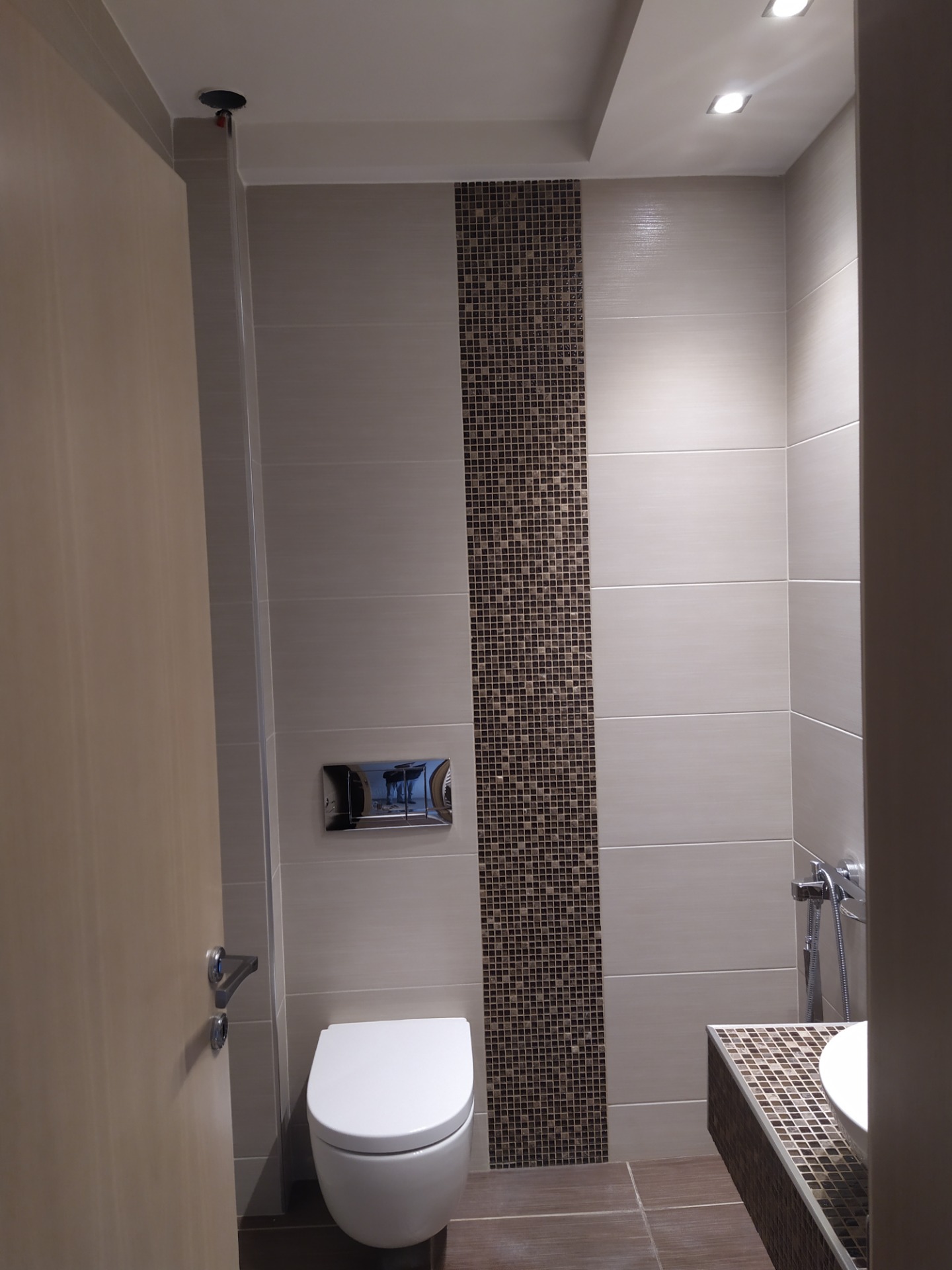 Επένδυση τοίχων και δαπέδων με πλακάκια (επιλογή πελάτη). Ντουζιέρα με γυάλινη καμπίνα αλουμινίου. Μπαταρίες νιπτήρα και λουτρού επώνυμης εταιρείας. Έπιπλο μπάνιου με νιπτήρα και καθρέπτη. Προμήθεια και τοποθέτηση λεκάνης/καζανάκι και νέου θερμαντικού σώματος μπάνιου (πετσετοκρεμάστρα). Πλήρες σετ αξεσουάρ μπάνιου. Επιλογή όλων των παραπάνω υλικών από τον ιδιοκτήτη.